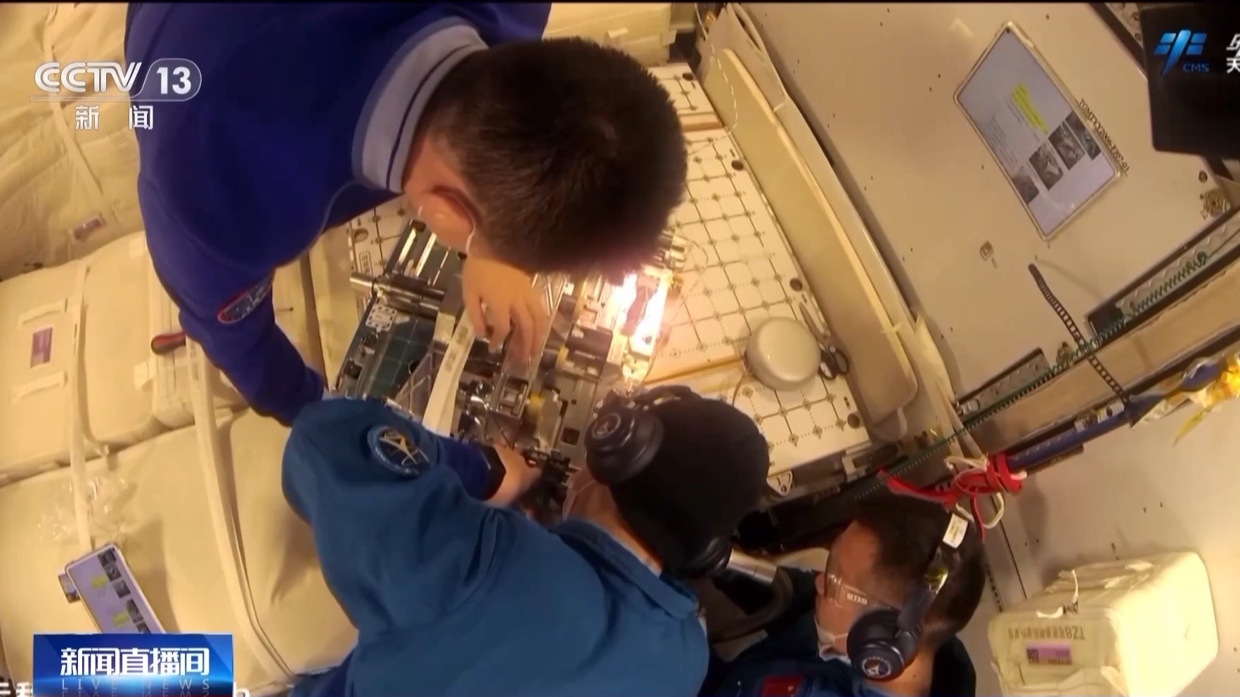 微重力物理科学领域多个实验项目持续进行中,乘组完成了流体物理实验柜及高温材料实验柜实验样品更换、抽真空排废气等多项工作。